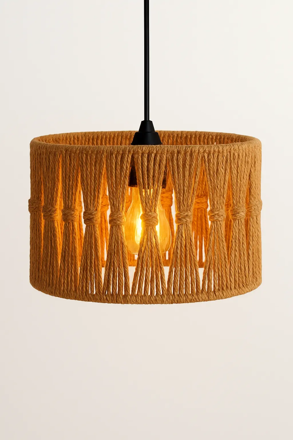 A modern boho chandelier made from treated burlap, offering both durability and beauty in one elegant design.